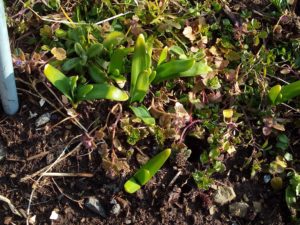 右: 水仙?10本弱、花壇の外側に発芽していました。