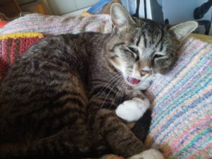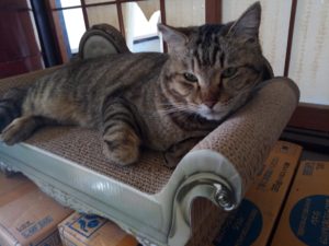庭仕事を終わって二階へ上がるとタイガーさんがソファーで寛いでいました。臭い付けをすると私にスプレーの水を掛けられるのをとても嫌がっています(笑)。アンタも同じ事しているでしょう?