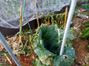 右: 今朝も縛り直し。生長旺盛なキャベツさんでした。