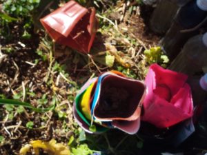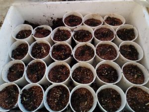 24個の紙カップを入れました。プラカップを入れるとギューギュー詰めになりそうなので、物干しに置いてあった囊ビの下へ潜り込ませました。水遣りをして2-3時間経って土が温まったらトウモロコシを植えます。