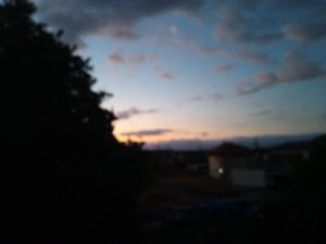 6時20分前になって雨戸を開けたら、既に東-南東が明け始めていました。南東の海際の山の上の空が茜に染まっています。