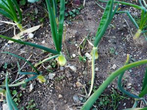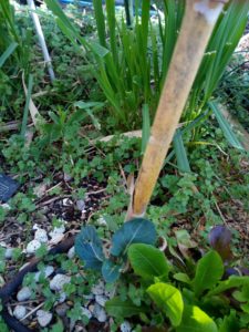 左: 大蒜は麻紐から支柱に変えました。この方が頭に入り易いです。