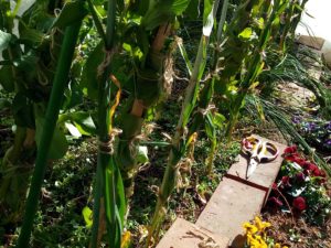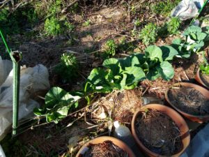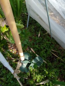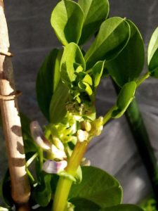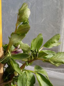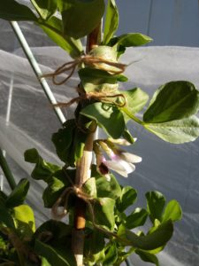中: 蚕豆には花が咲いていますが、これは嘗てウイルスに遣られた株です。すっかり綺麗な葉を出しました。