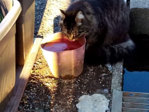 4時半過ぎに戻ったうめがジュレを食べていました。さっきはお腹が空っぽで無かっただけなの?食事をしたら、炬燵の中へ飛びこんで行きました。今まで平気で行動していた福もカーペットの上に来ました。やはり0度は寒いよね。