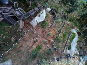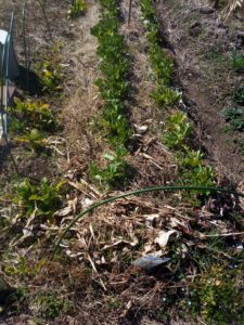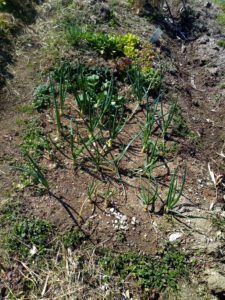 西隣さんの畝も玉葱畝にはまた小さな草たちが出ていたので、楽な内に鋸鎌でカリカリ!大蒜の周りにもびっしり草が生えていました。