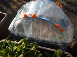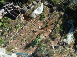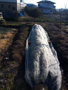 サツマイモの伏せ込みを玄関アプローチでスタートです。農ビを二重にして…ドームの方は南西が一重です。