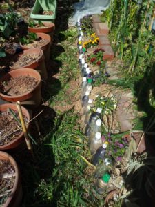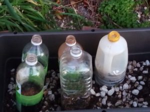 に電熱を遣わずにペットボトルで土を入れて種を蒔きます。