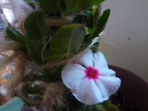 ニチニチソウ先生は本来の葉色ではありませんが、花を幾つも上げています。支柱にした孕み箸がみえなくなりました。そろそろ鉢増しをして上げようかな。