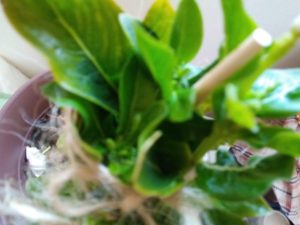 ニチニチソウ先生も一回り大きな鉢に鉢増しし、これまでニチニチソウ先生が使っていた茶色のポリポットに市販の細葱と三つ葉が入りました。