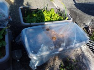 合計3本の向陽ボトルを作りました。トスカーナと共に白躑躅下へ置きます。茄子の種はキッチンペーパーに包んでプライミング中です。