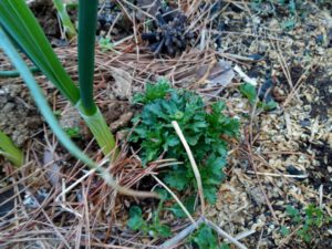 中: 竹串よりも細かった玉葱苗が生長して来ました。