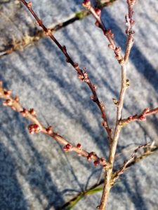 西隣さんの畝と梅と庭梅の蕾とアサツキが発芽。