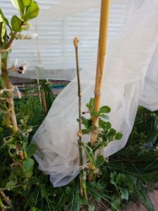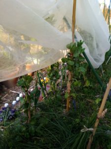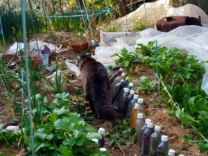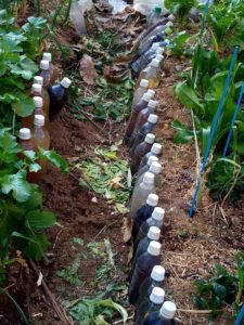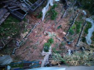 トウモロコシ予定地(写真左下のボトルの際、一際緑が濃い処)も北側だけは植え筋を付けて見ました。後はジャガイモプランターに種芋を植え付けです。