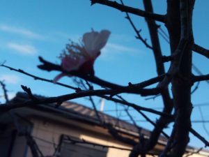 左: 梅の花がピンクになっていました。元々東京のアパートの庭に在った時はほんのり薄紅色の梅でした。丁度三階の我が家の真ん前に在りました。その子供です。