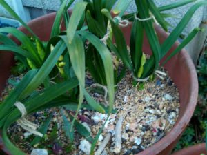 中: 玄関前の水仙二種。手前の水仙は一月も後から発芽したのに蕾を上げるのは超特急でした。
