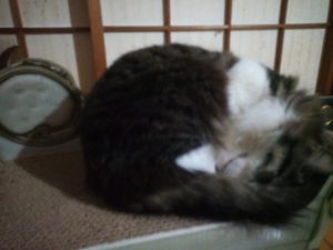 10時、うめが外出。トラ子もその前に外出して行きました。家には外から戻ってきた福が寝ています。
