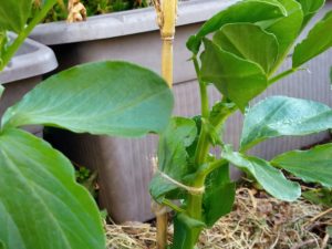右: 西隣さんから頂いた蚕豆の花は来週あたりに開きそうです。