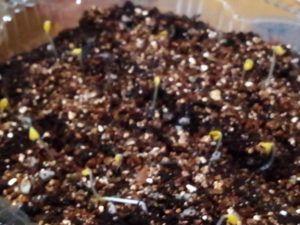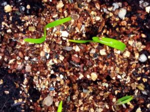 現在待機中の物はおつな姫という大豆(枝豆)です。13時、昨日から湯たんぽとホットカーペットで温められたおつな姫の12個中3個が地表に豆を押し出して来ました。