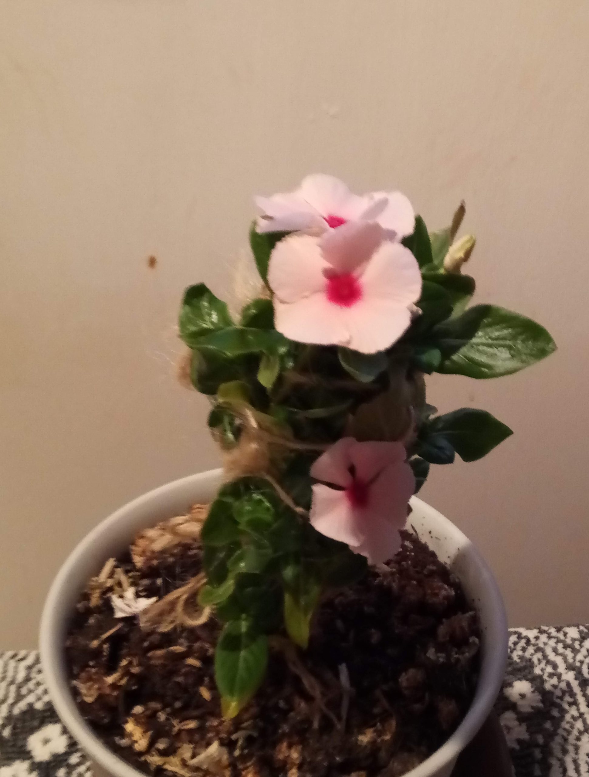 二階の廊下の嵌め殺しの窓に居るニチニチソウは昨年秋、零れ種で芽生えた株です。10月少し形になって来ましたが、その時は鉢上げをするつもりは全くありませんでした。11月寒波が来始め、かじかんで花を咲かせていたので、鉢上げしました。丁度、私が垂直仕立て栽培を知った頃で、オーキシン、エチレン、ジベレリン、サイトカイニン等々の働きを見る為に孕み箸の支柱を立てて、勉強させて貰いました。極寒期の夜は室内の段ボールに入れていました。水遣りは朝ではなく、夕方たっぷりとします。昼間は光合成をし、夜間に生長をしています。朝になると大きくなってているんですよねぇ。今までの園芸の常識とは正反対です。これもdisclosureの一部なのでしょうか?