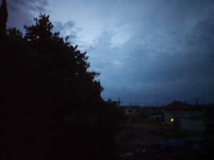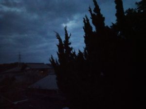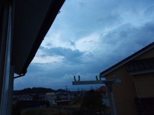 6時半過ぎ、西南西に濃い灰色の雲が上がって来ました。近づいて来るのでしょう。猫達は家で寝ています。