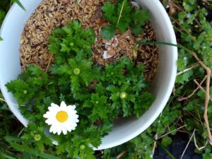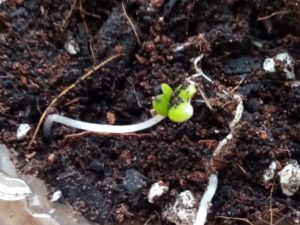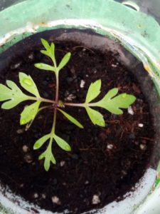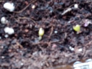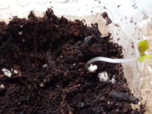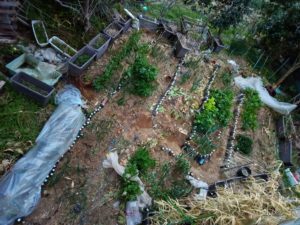中: 白躑躅下のトマトのwinter-sowingボトルです。外に出した途端に大きくなりました。今日は朝方曇っていて雨も来たから、野菜達を物干しに出すのは躊躇下ましたが、トマトのこの変化を目の当たりにして、思い切って太陽光を浴びさせ様と決心しました。