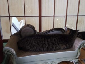 今朝は四時起きでした。猫達は私が起きる気配でピョンピョン、と元気に集まって来ました。私の枕の辺りでウロウロしていたうめも近くの棚でジッと待っていた福も、布団の上で『俺も待ってた~』、と言いたげなトラ子も食事をすると一斉に外出して行きました。