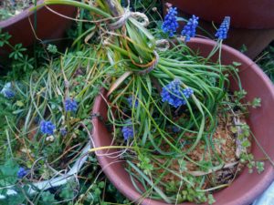 右: ムスカリの花が増えました。やはり垂直仕立て栽培は違うのかな。