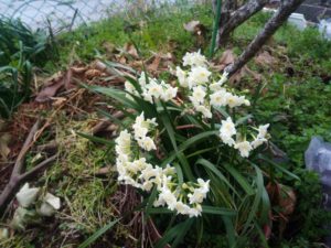 左: 梅の木の下に置いた鉢でこんもりと咲いているのは芳香水仙。