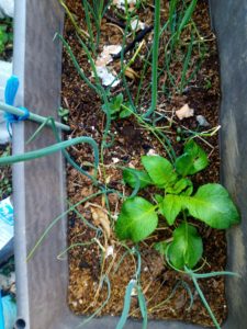 右: 此方は晩生汐留長葱のプランターに出たジャガイモ。
