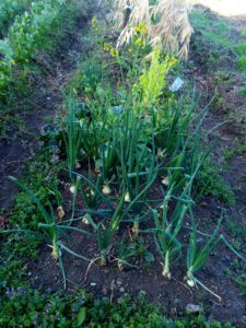 中: サツマイモの伏せ込み用トンネルですが、中の大蒜も大きく育っています。今年はトンネル大蒜と露地大蒜の比較が出来ますね。