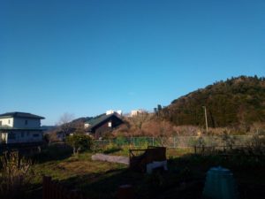 見て下さい、この青空。西隣さんの玉葱畝、右は蚕豆です。