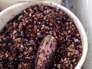 左: 紅花インゲン(紫花豆)の双葉が持ち上がって来ました。デカイ!
