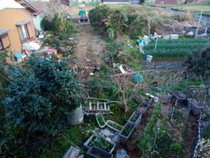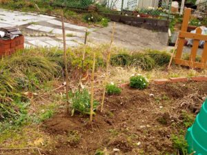 蚕豆を縛っていましたが、重機が段々と近くなって来ます。カイヅカイブキの伐採の塵を吸い込むむのは嫌なので、一旦対比。今日は出来ないかもね。