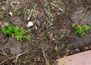 たっぷりと天水を頂いて黒々とした土になりました。種蒔きをした処は草を被せてそれが動いていないから、種は流れてはいないでしょう。