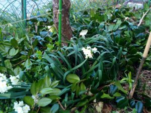 左&中: 梅の木の下は昨日カイヅカイブキを切る時に負傷した椿の枝を切り離し、広葉樹なので、葉を梅の樹冠下に撒きました。