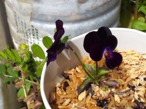 左: 種から育てたビオラは立った一本残っただけでしたが、個性的で黒に近い紫です。