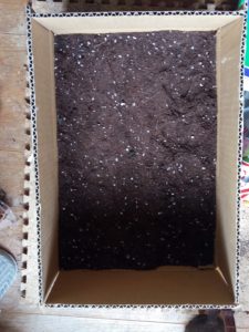 段ボールに庭の通路の土を入れて、培養土を入れて30個の枝豆を蒔きました。種が古いからどうかなぁ。今度の27日土曜日に水をあげます。