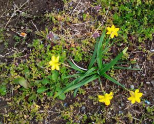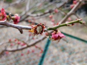 上段左: 梅の中を覗くと小さな梅の赤ちゃんが!中: 黄水仙。右: 柔軟体操中のうめ。