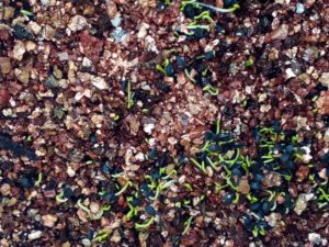 右の写真の発芽が、トマトは20粒位の種を落したはずなのに、こんなに沢山出るなんて私ってこんなに欲が張っているのかしら。寝ている時に閃きました。『あれは細葱だよ。』あ、そうか!トマトの病気を予防する為に万能葉葱をドバーッと蒔いたんだっけ!?忘れてました(笑)。