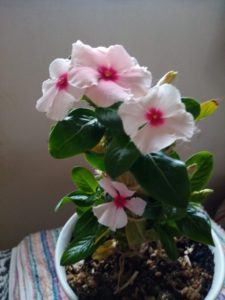 左: ニチニチソウ先生も暖かさを感じて本領発揮です。4つの花と3つの蕾をあげています。