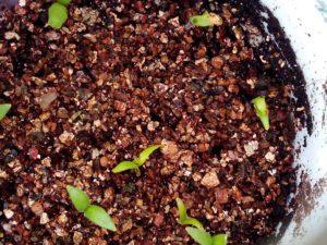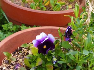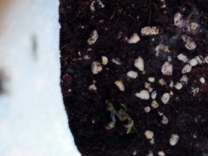 左: 去年植えた茄子の子供たち。 右: トスカーナバイオレットの葉が出て来ました。