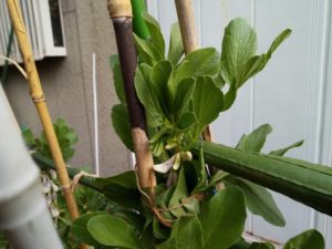 右: アルビノだったので生長が遅れましたが、すっかり治りましたね。これは柿の木下の蚕豆です。