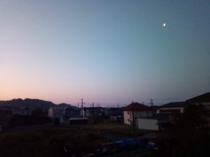 本日の日出は5時26分、日の入りが17時55分です。日の入りは12月初めより90分近く動いています。真南に半月が浮かんでいます。4月1日15時25分が新月です。