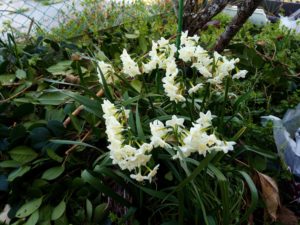 下段: Wさんから頂いたショッキングピンクの花が加わりました。お隣さんからもKさんが『わぁ!綺麗!』、と言っていたラッパ水仙を頂く事になりました。