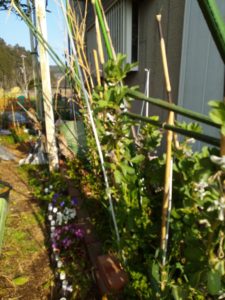 中&右: 蚕豆の支柱は180㎝必要です。30㎝土の中へ入れて、残り150㎝が地上部です。