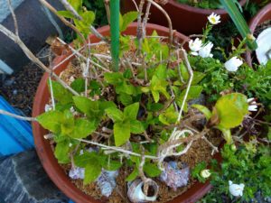 左: 玄関前の紫陽花の鉢に新芽が出ています。
