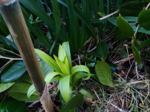 中: 鉄砲ユリ(園芸種)は刈草マルチから3日前に顔を出したばかりで色白です。