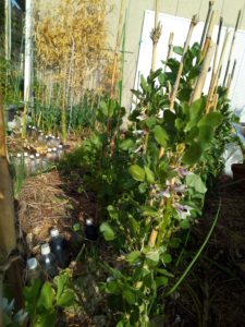 中: 玉葱と豆の畝。