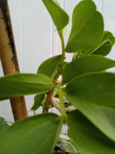 蚕豆さんは昨日午前中に結わえたけれど、また延びてる!凄いねぇ。右: 金柑の種が芽を出しています。