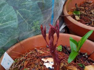 夏蜜柑を一つ収穫です。西側の枝の実も収穫して上げないと、木が疲れてしまうかもね。表は未だ小雨が降っていました。霧雨かな?芍薬の芽がグン!、と伸びていました。高菜も小松菜も盛り上がって来ましたよ。どちらを先にするかなぁ。大根は根の部分が大丈夫であればぬか漬けにしても良いな。